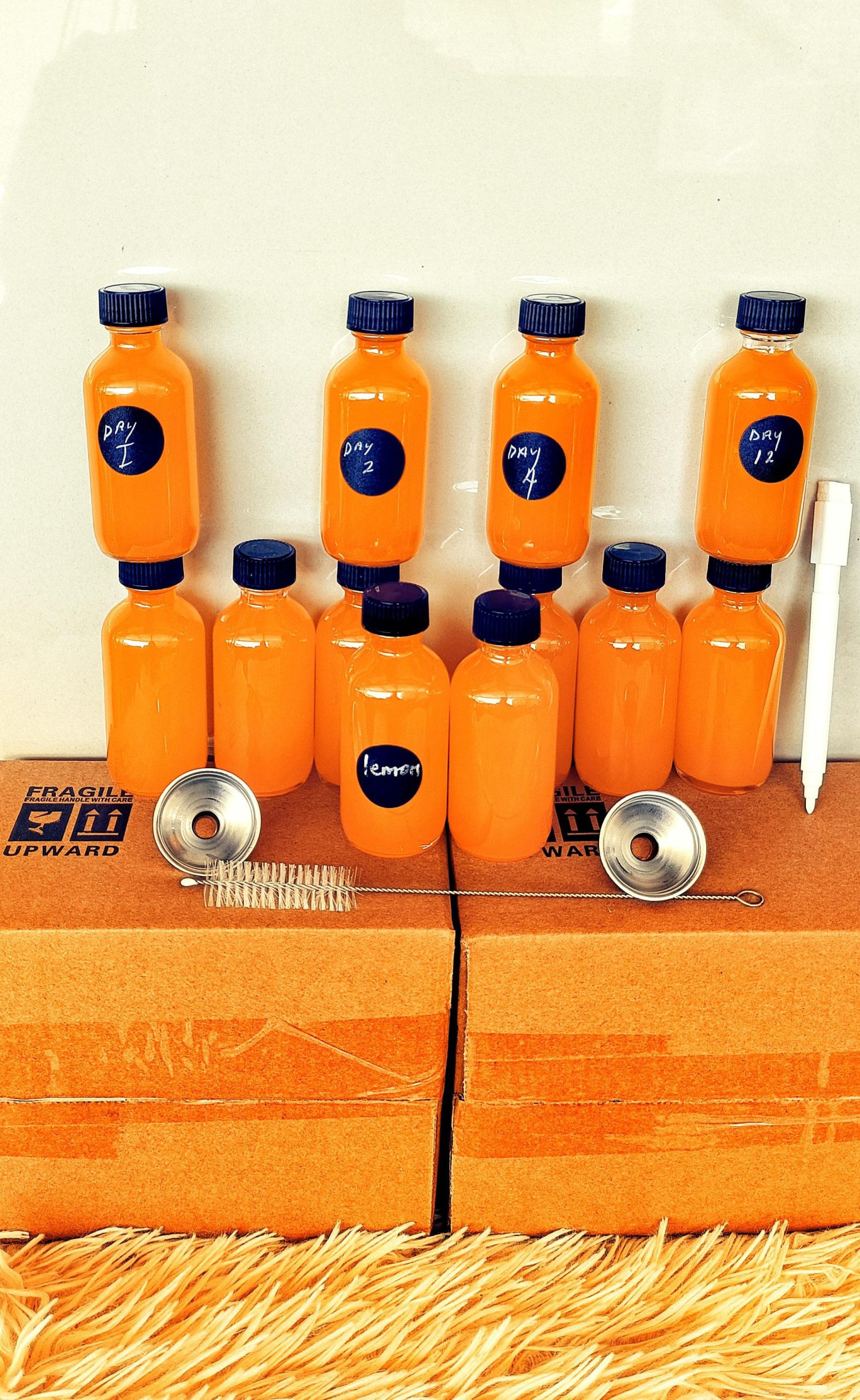 12 pcs bottles 2 funnels 1 cleaning brush 1 pen Writable stickers